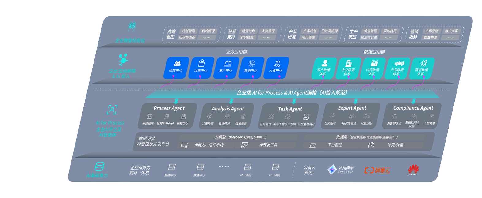 端到端的一站式AI工作空间深度融合了从企业战略规划到日常经营的全流程业务板块,,定向解决车企内部领域多、、部门多、、链条长、、、场景碎片化等难题,,,支持车企快速构建以AI为核心的生产力写作体系,,实现任务执行与AI能力的无缝集成与交互