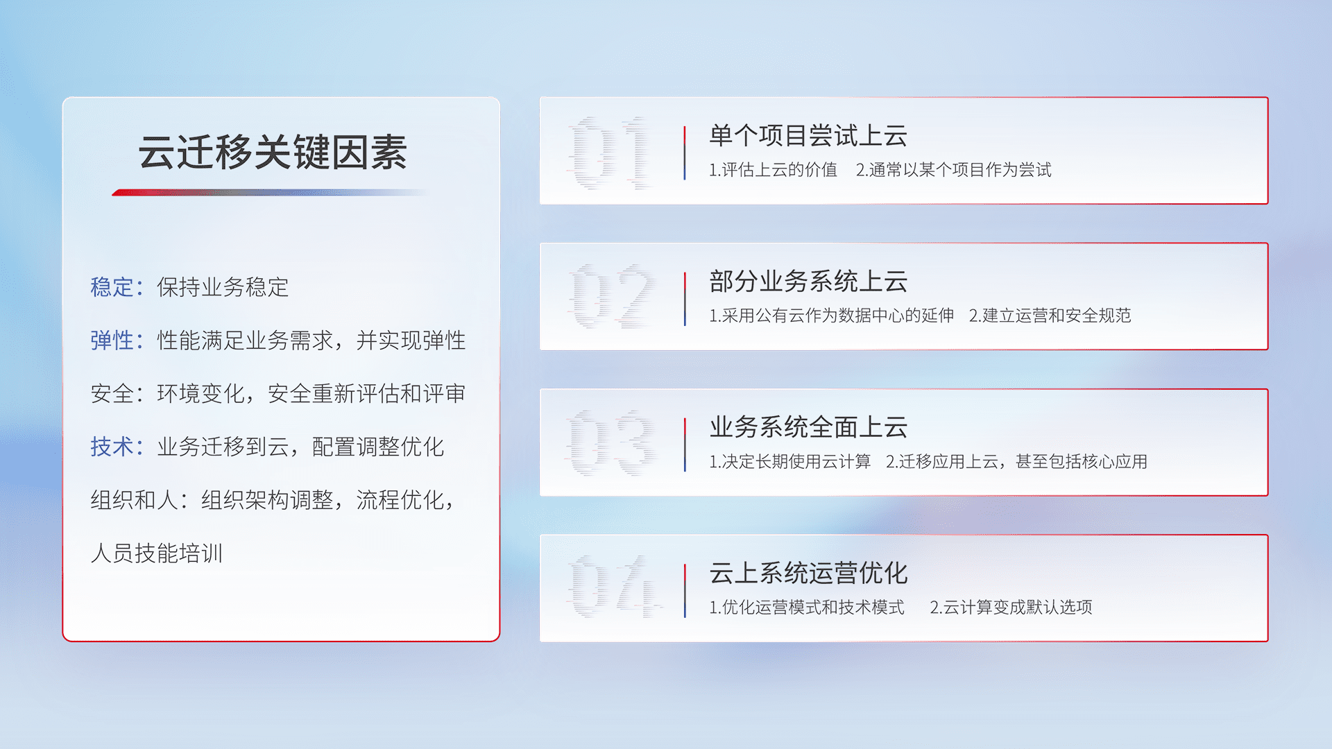 结合实际业务,,从规划设计、、、、云平台选型、、云原生改造、、、、数据迁移、、集成交付,,,,迁移全过程为客户识别最佳上云路径,,做好风险识别管理,,,设计网络架构、、、、身份权限、、、安全审计合规、、、、操作审计、、、日志审计、、监控告警策略、、、、多站点容灾设计等,,对云上基础设施进行整体规划,,提升IT治理水平,,,,以满足弹性、、、、高可用、、、、高性能的需求。。。