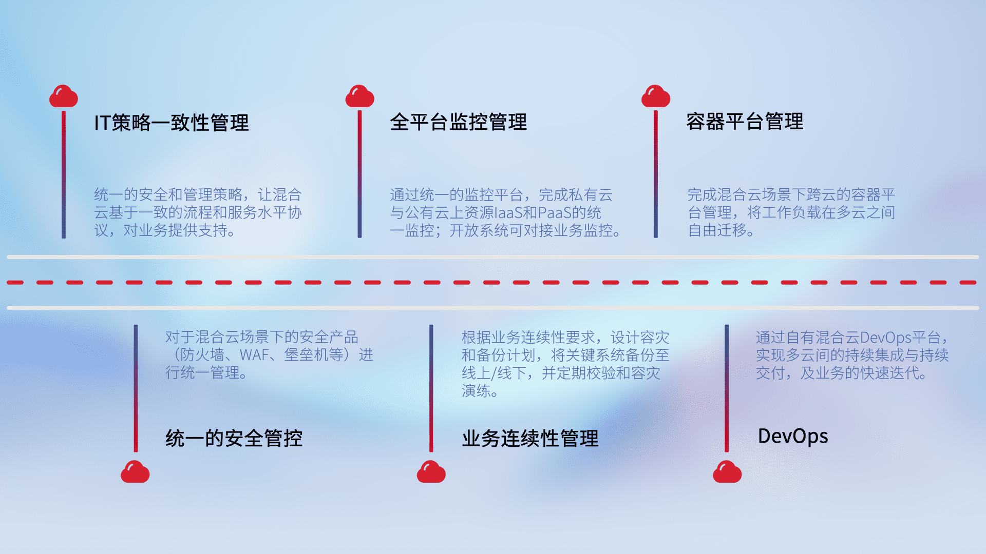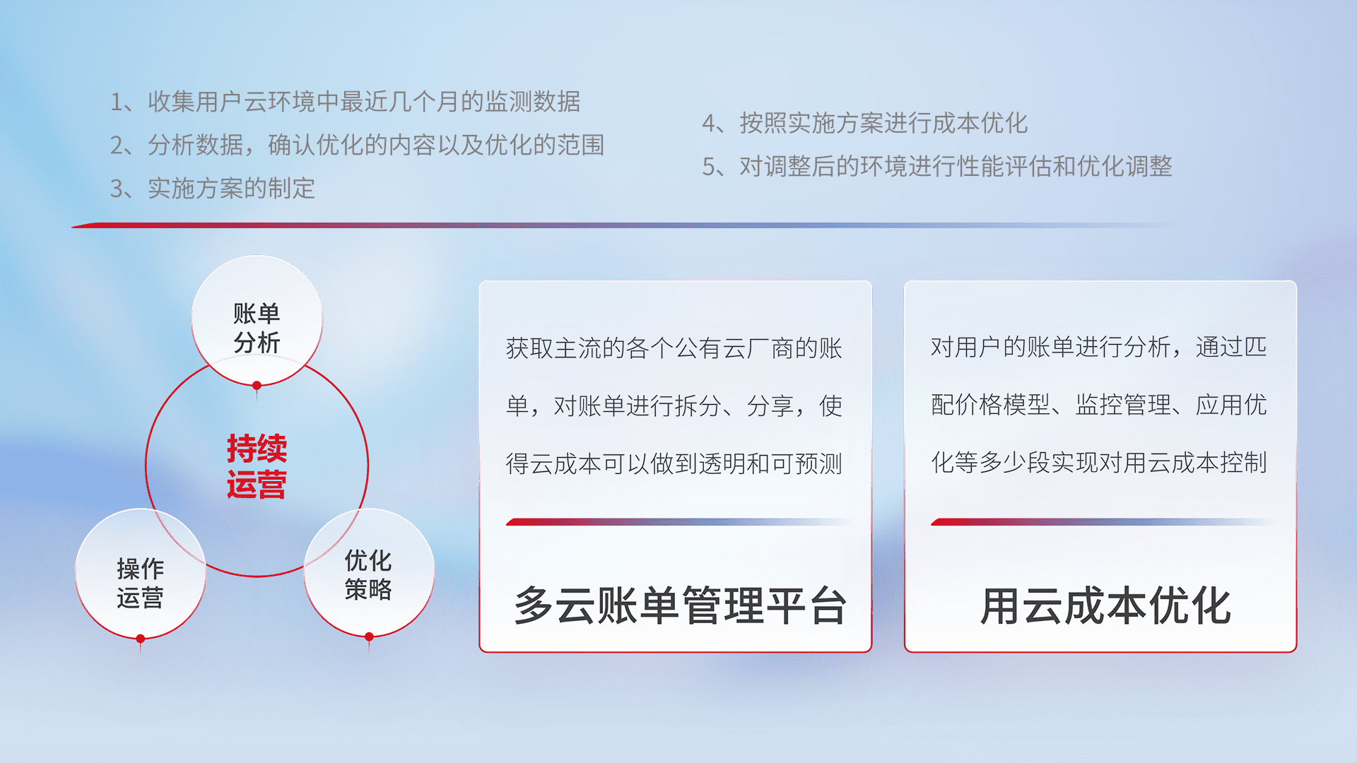 通过多云纳管,,,,以统一的资源数据模型把客户的云资源进行抽象和封装,,,,进而实现对多云资源的统一操作,,,保障云资源管理的可靠性、、、、稳定性与可用性。。量身定制化运维内容,,,,配置、、、开发运维、、、、补丁管理、、、备份、、、、监控、、、认证和访问管理、、审计和日常巡检等,,,,保障在用云过程中的可靠度,,,稳定度以及高可用率。。。。